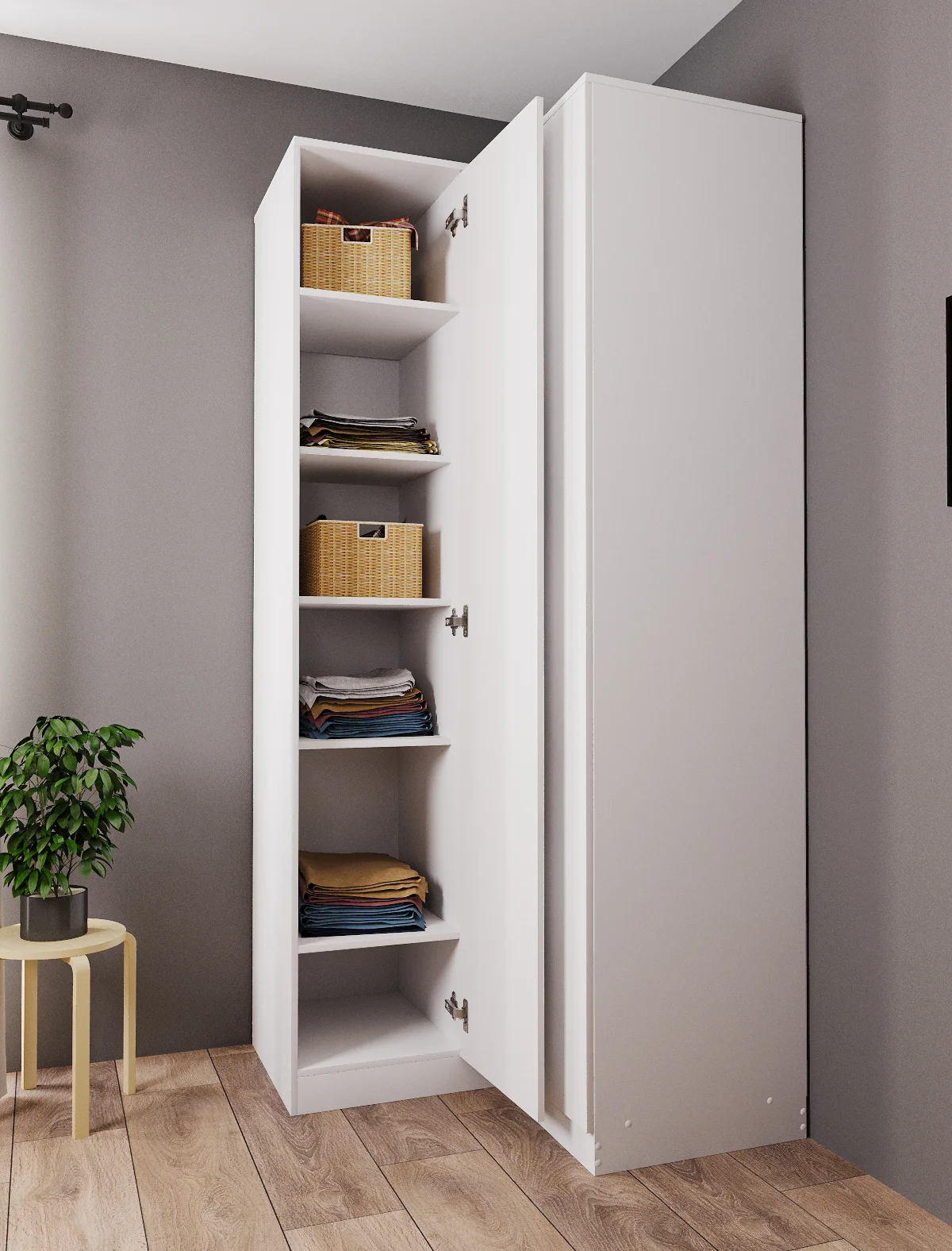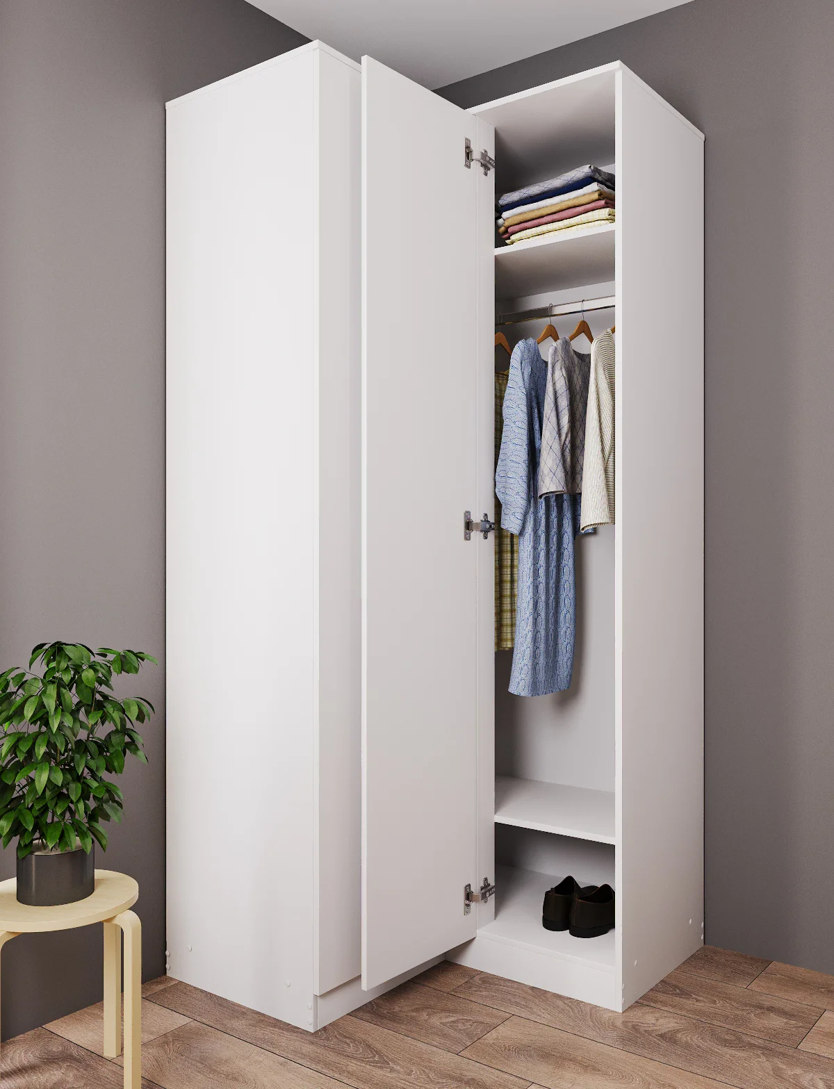 Шкаф оснащен платяной штангой и полками, что позволяет удобно хранить одежду и другие предметы. Фасады перевешиваемые и могут устанавливаться с правым или левым направлением открывания. Открывание происходит путем нажатия на фасад, который отталкивается от корпуса магнитным толкателем.