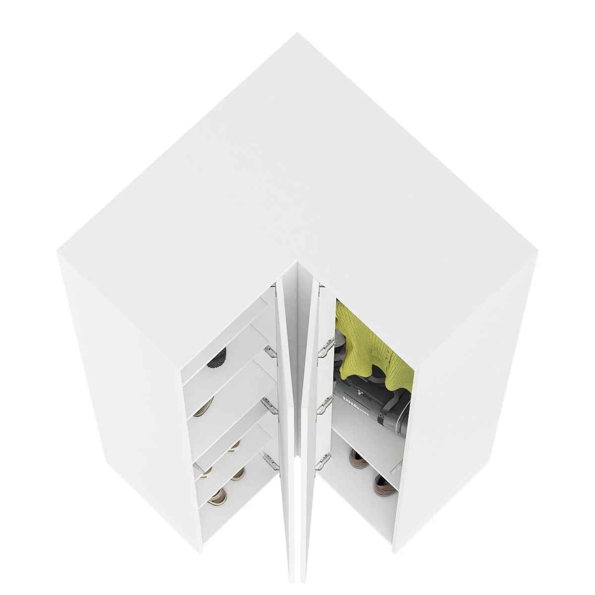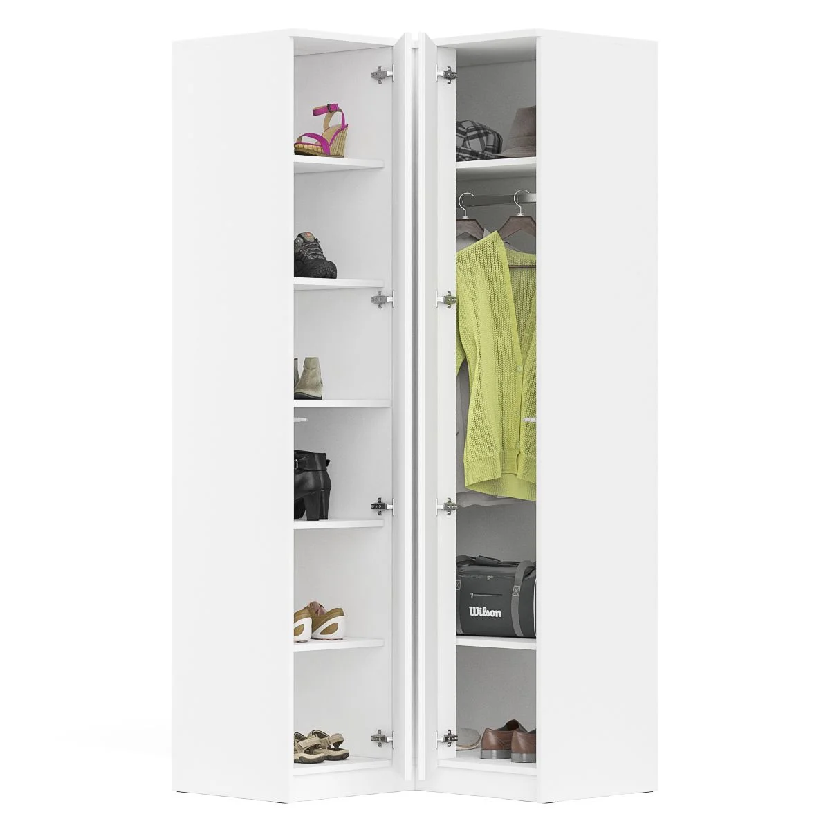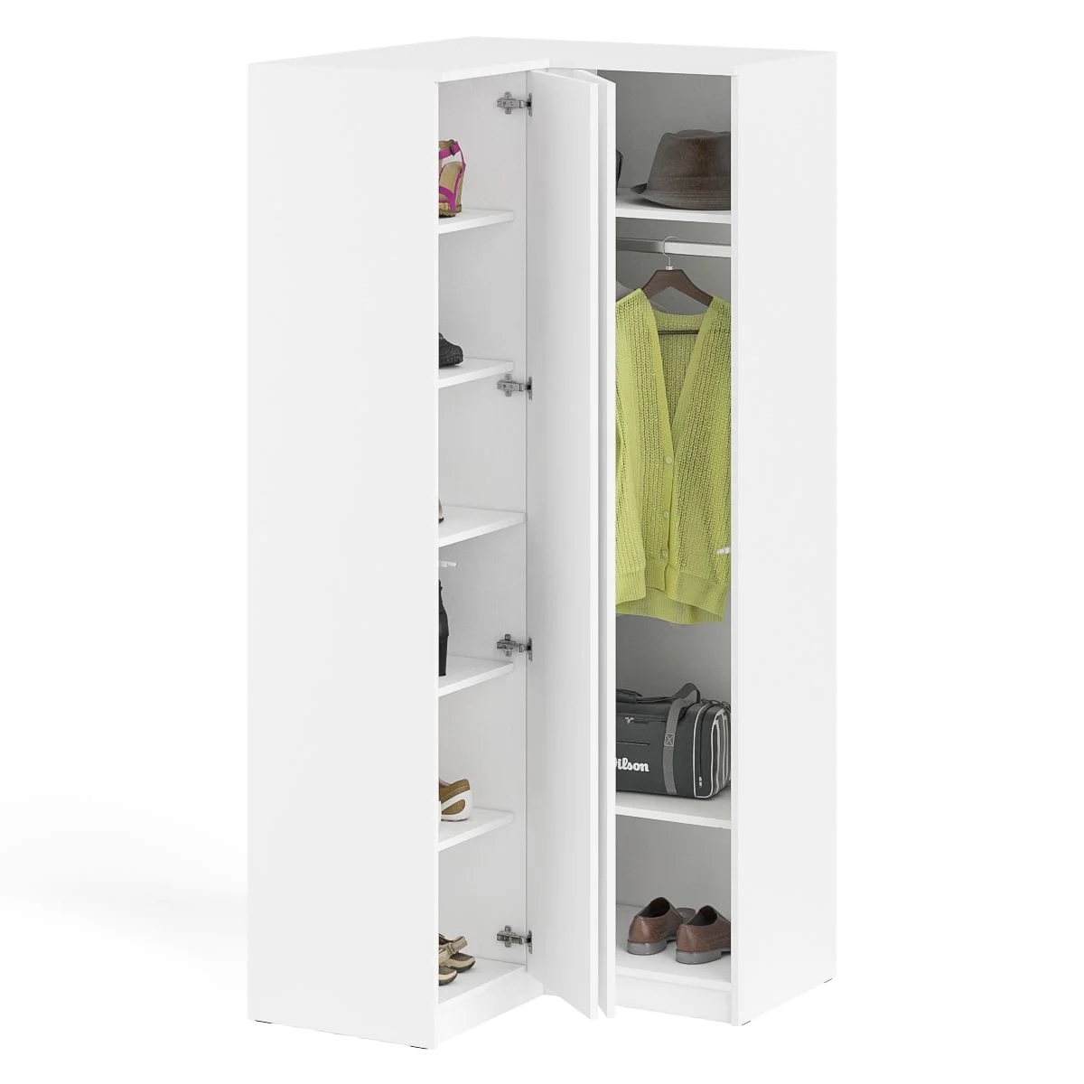 Угловой шкаф МШУ 960.1 белый - это стильное и функциональное решение для хранения одежды, обуви и аксессуаров. Угловая конструкция шкафа позволяет максимально эффективно использовать пространство в углу комнаты, а также обеспечивает удобный доступ к содержимому.