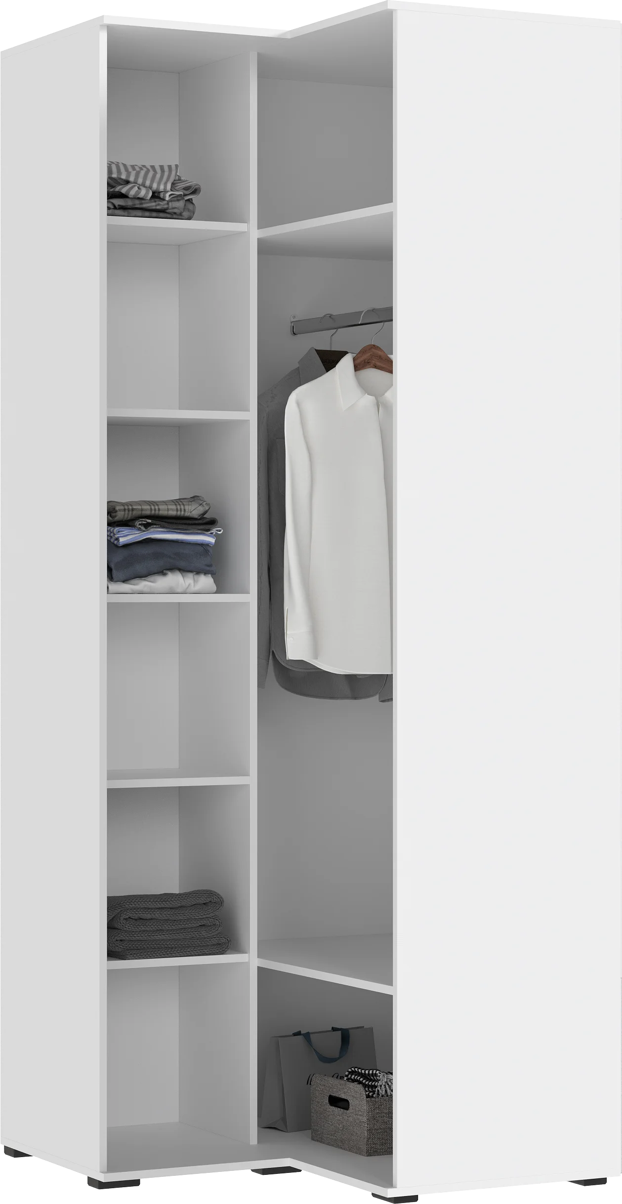Внутри шкафа расположены удобные полки для одежды, обуви и аксессуаров, а также штанга для хранения верхней одежды.