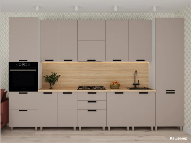 Гладкие фасады без фрезеровки создают ощущение чистоты и легкости, а спокойная геометрия делает серию кухонь Лаванда универсальной основой для современной кухни. Матовая поверхность подчёркивает естественную глубину оттенков, приятна на ощупь и проста в уходе – практичное решение для ежедневного использования. Фасады сохраняют первозданный вид даже при активной эксплуатации.