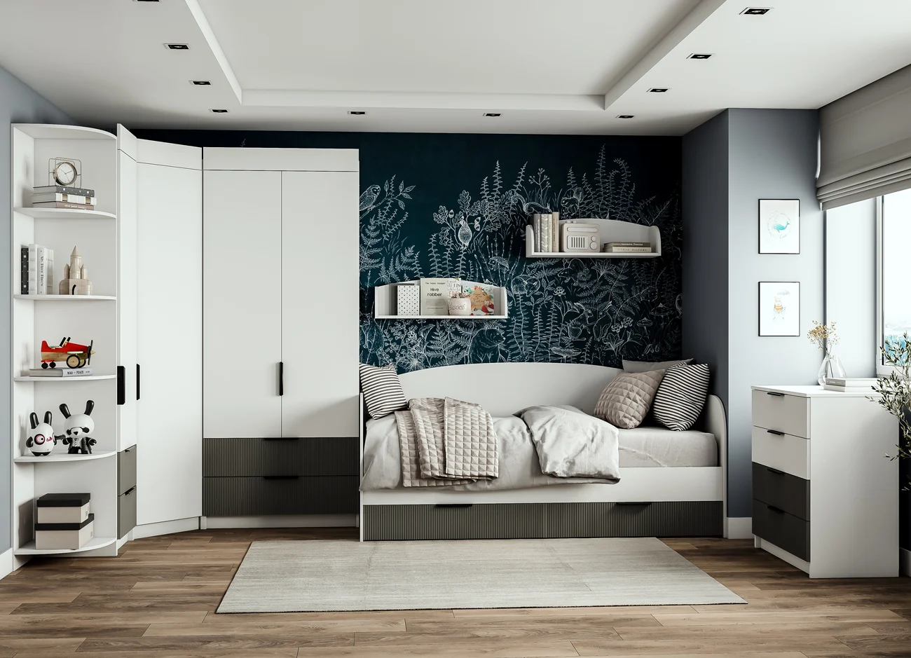 Комплект включает: три шкафа (один шириной 900 мм, другой — 450 мм, и угловой), стеллаж шириной 450 мм, комод и диван-кровать, торцевое окончание с полками. Уникальные фасады с рельефной вертикальной фрезеровкой придают мебели особый шарм.