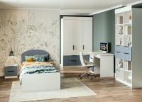 Комплект модульной мебели включает в себя стеллаж, кровать, стол, шкаф шириной 900 см, шкаф шириной 450 см и прикроватную тумбу. Такая мебель поможет организовать пространство комнаты практично и стильно.