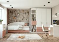 Комплект включает письменный стол, два шкафа (один шириной 900 мм, другой — 450 мм), стеллаж шириной 450 мм, комод и диван-кровать. Уникальные фасады с рельефной вертикальной фрезеровкой придают мебели особый шарм.