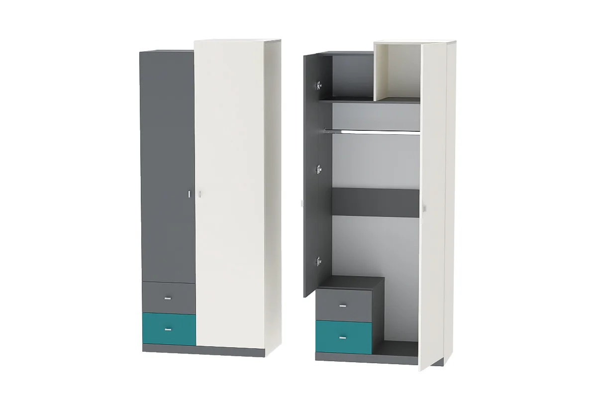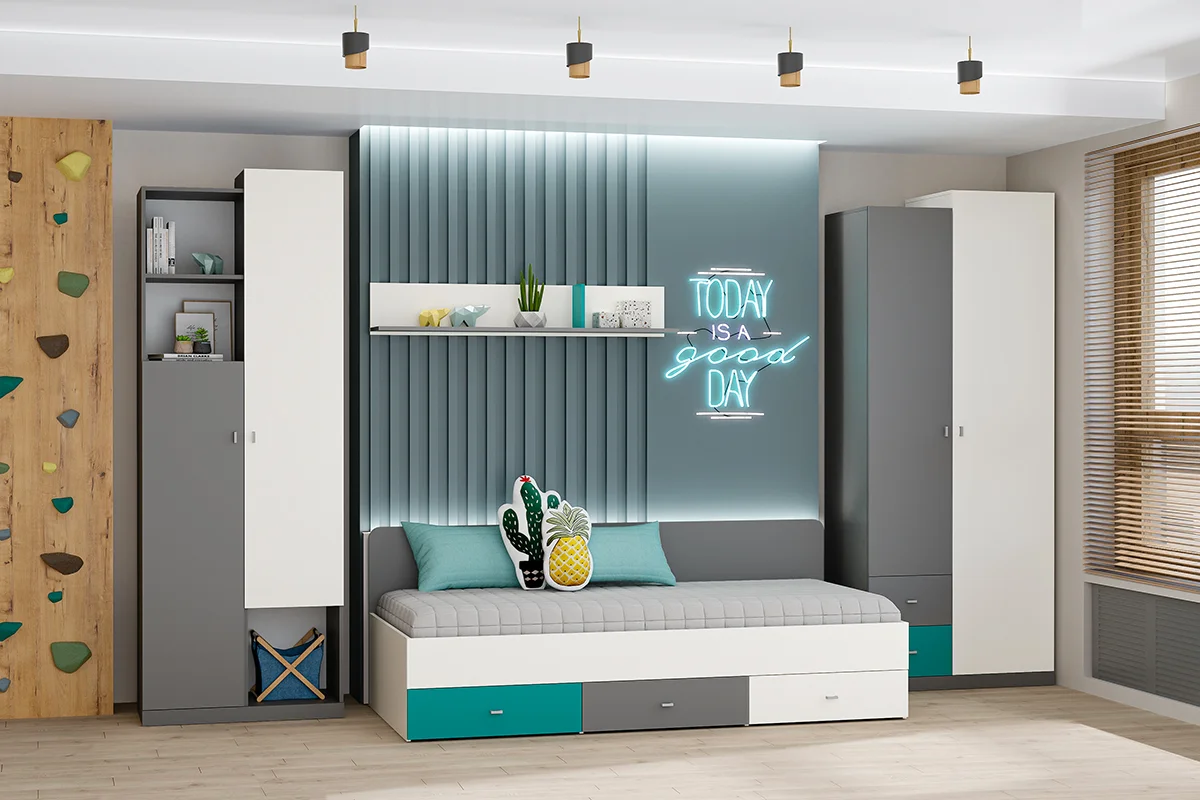 Кроме того, в комплект входит шкаф ШК-1, где за створками расположена антресольная полка (разделённая перегородкой на два отделения) и металлическая штанга для одежды (900 х 2220 х 520 мм). Мебель Клео сочетает в себе практичность и современный дизайн, что особенно важно для молодёжной комнаты. Такой комплект поможет организовать удобное и стильное пространство для подростка.