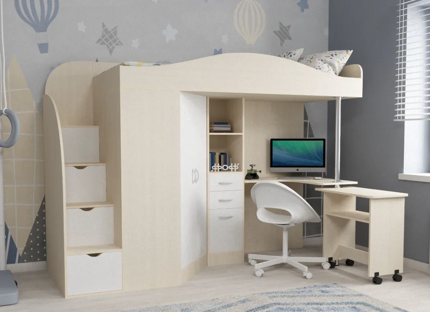 В угловом шкафу с распашными дверцами 3 полки и штанга длинной 80 см перпендикулярно задней стенке. Рядом со шкафом две открытые полки, под ними два выдвижных ящика и распашной ящик, в нижним распашном ящике полки нет, стол на колесных опорах, стол поворачивается на 360 градусов.