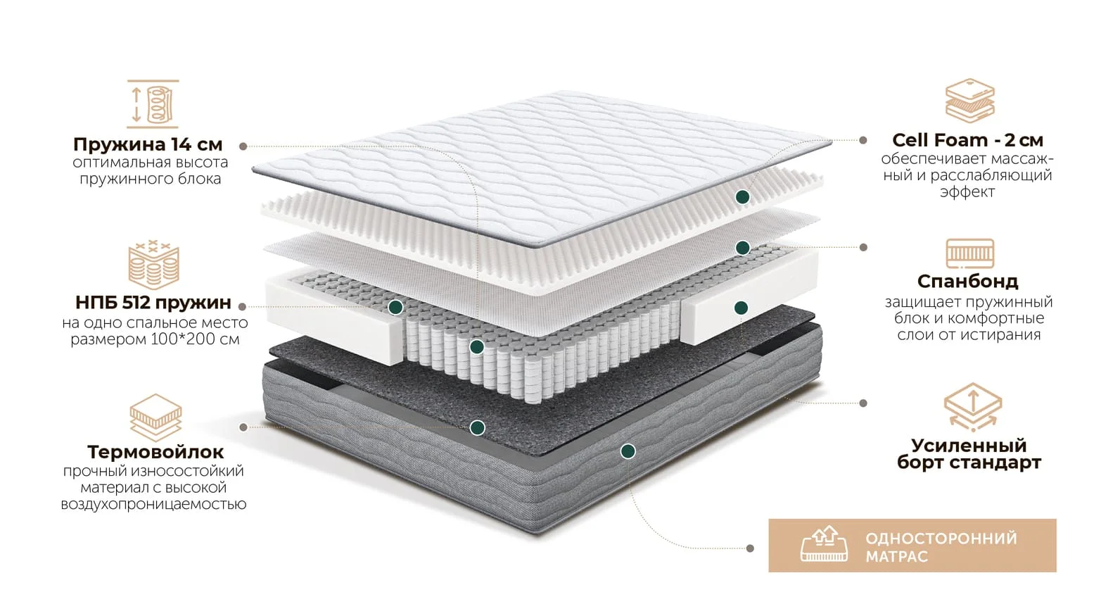 Независимый пружинный блок 512 пружин на одно сп.место размером 100*200 см - 14 см