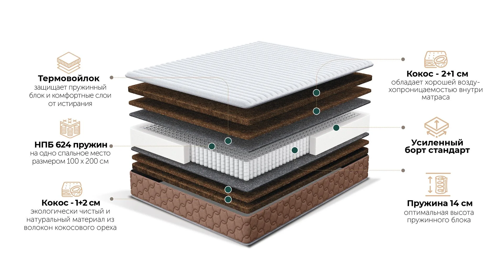Независимый пружинный блок 624 пружин на одно сп.место размером 100*200 см - 14 см.