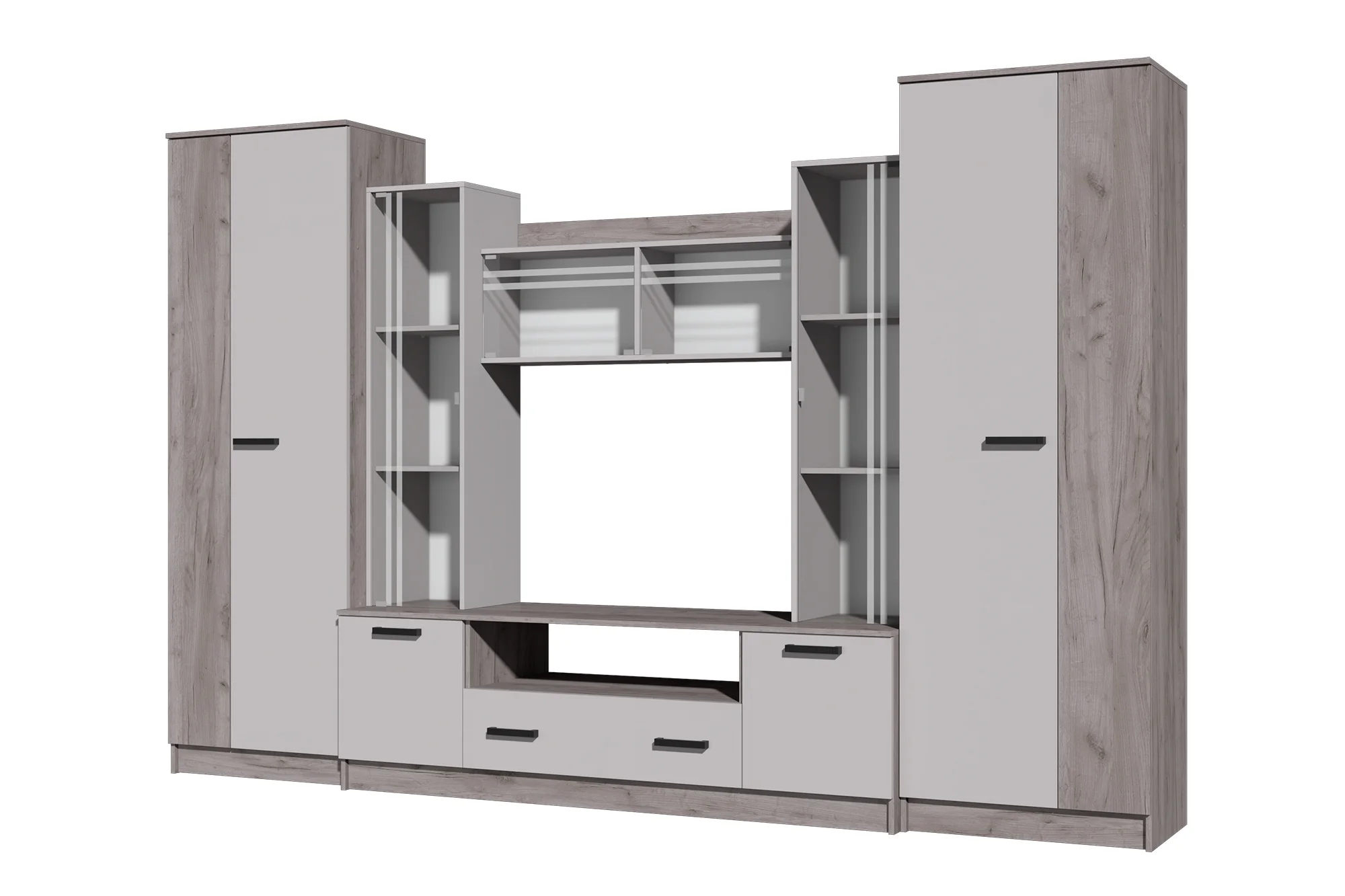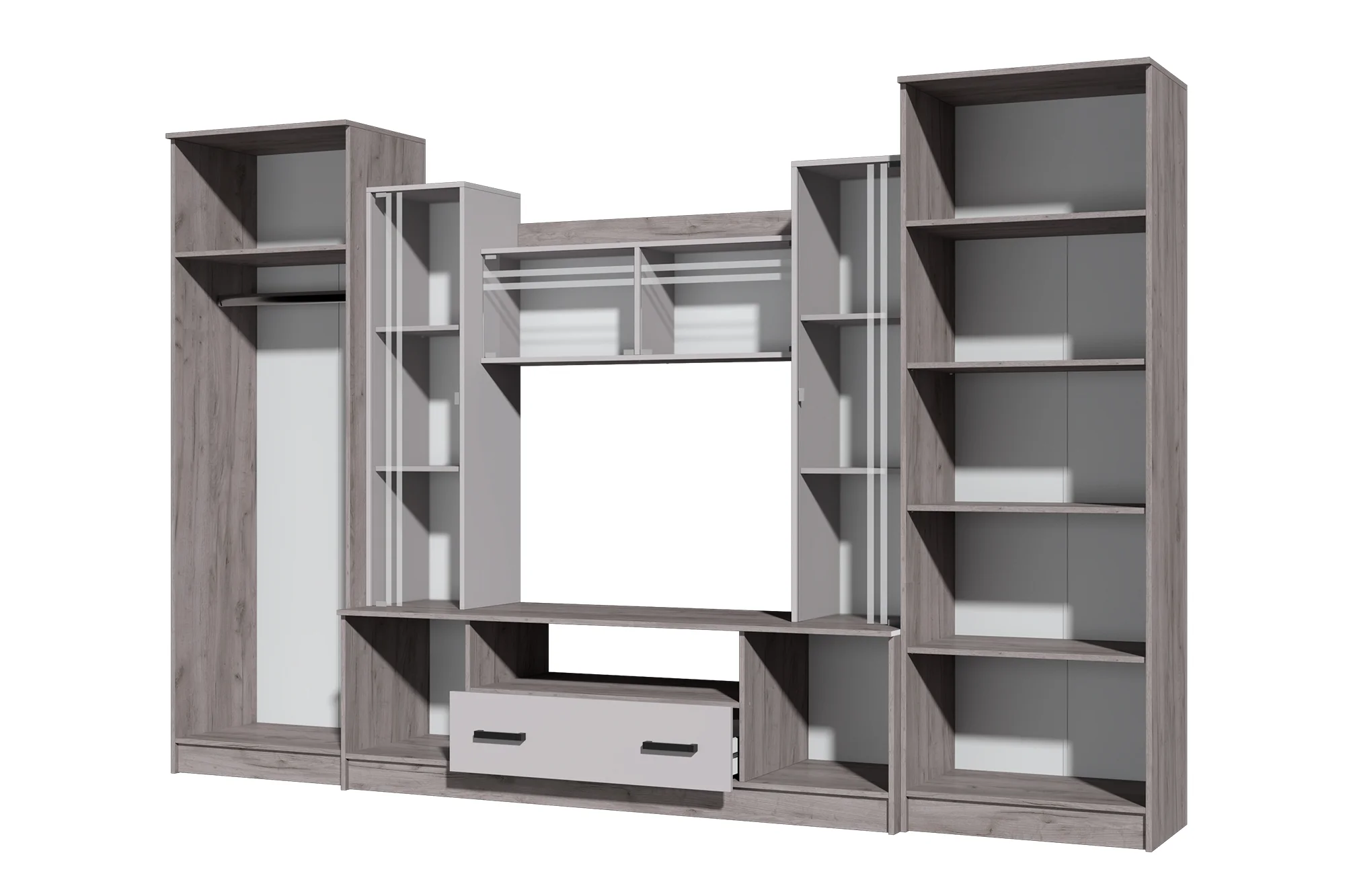 Ширина платяного шкафа — 700 мм, что позволяет использовать его для хранения большого количества вещей. Тумба под ТВ состоит из вместительного ящика (внутренний размер — 520 х 370 мм) и двух небольших отсеков за распашными дверцами.