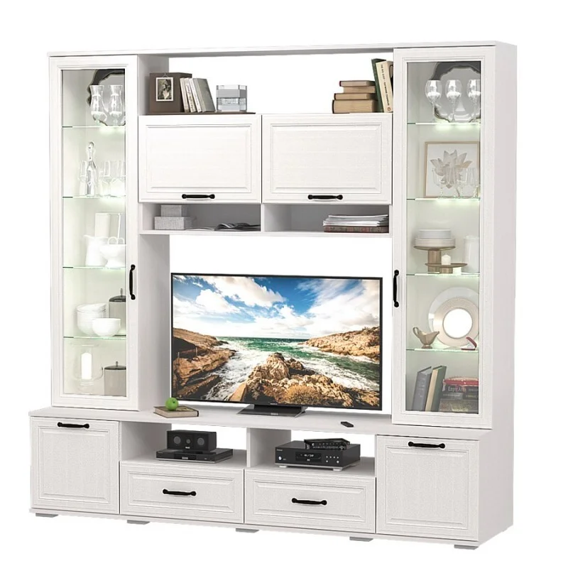 Размер ниши под ТВ 1200 х 810 мм. Витрины с газовыми кронштейнами и амортизаторами. Ящики полного выдвижения.