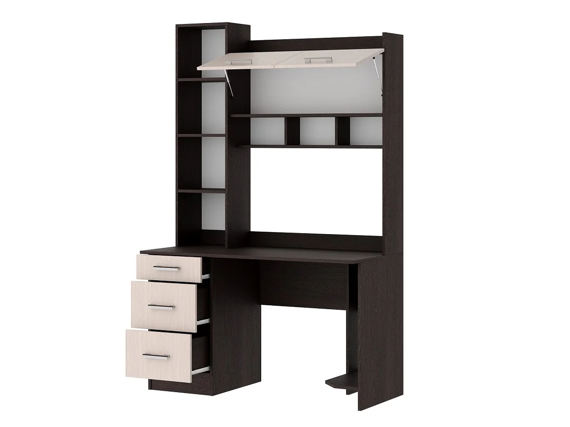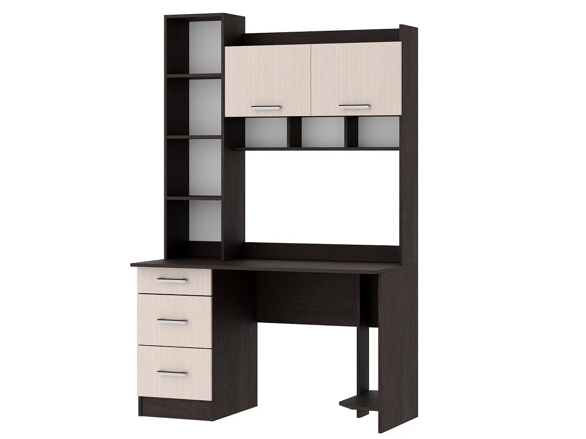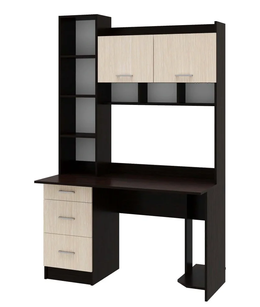 Рабочая зона стола: 902 мм по ширине, 600 мм по глубине и 540 мм по высоте. Цветовое исполнение: венге цаво/дуб белфорт. Ящики на роликовых направляющих: обеспечивают плавное и легкое открывание и закрывание. Газлифты в антресолях с открыванием вверх: обеспечивают удобное и безопасное использование. Расположение тумбы: слева. Высота: 196.0 см. Ширина: 125.0 см. Глубина: 60.0 см. Толщина столешницы: 1.6 см. Материал основания: ЛДСП. Материал столешницы: ЛДСП. Вес: 87.0 кг.