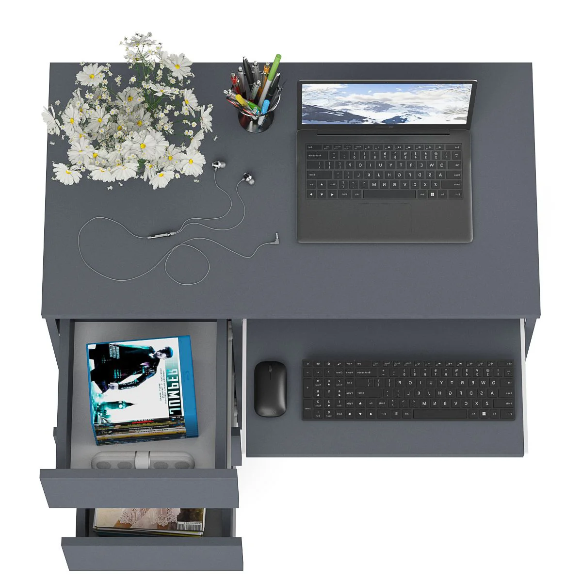 Стол оборудован тремя выдвижными ящиками, что позволяет удобно хранить различные предметы и аксессуары. Благодаря этому, вы всегда будете знать, где находятся нужные вещи, и они всегда будут под рукой. Особенностью стола является наличие полки для клавиатуры, что обеспечивает дополнительное удобство при работе за компьютером.