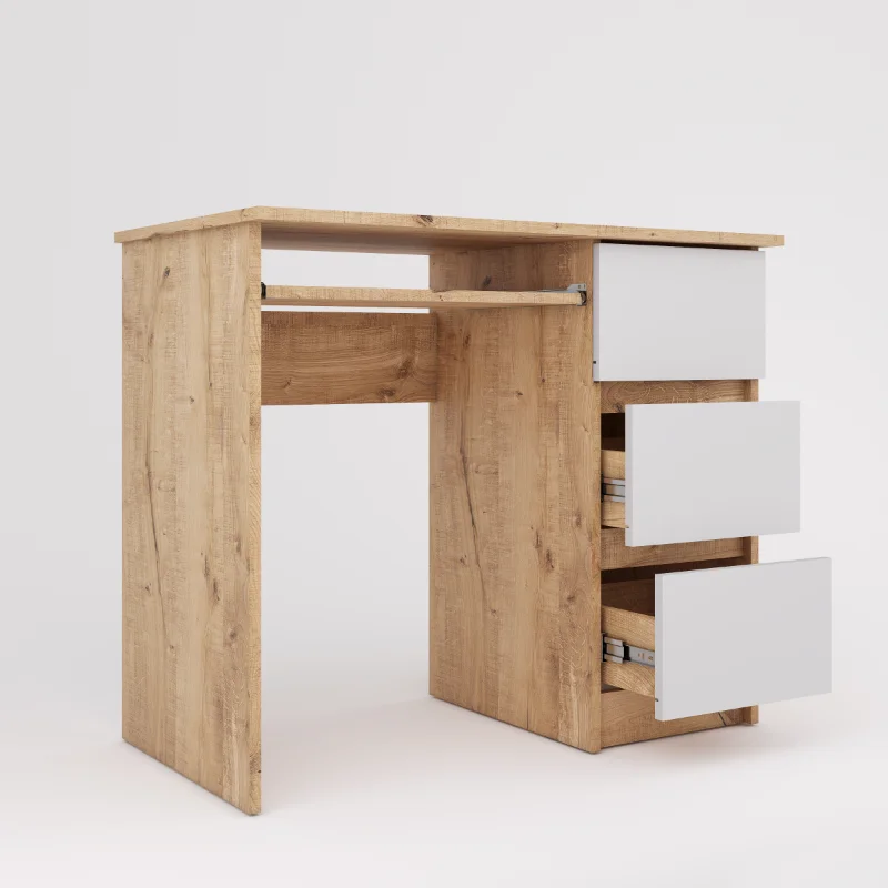 Стол имеет бежевый цвет с белыми фасадами, который придаст вашему рабочему месту стильный и современный вид. Особенностью стола является его конструкция. Ящики расположены справа, что позволяет удобно хранить необходимые предметы и документы. Глубина ящиков составляет 40 см, что обеспечивает достаточное пространство для хранения.