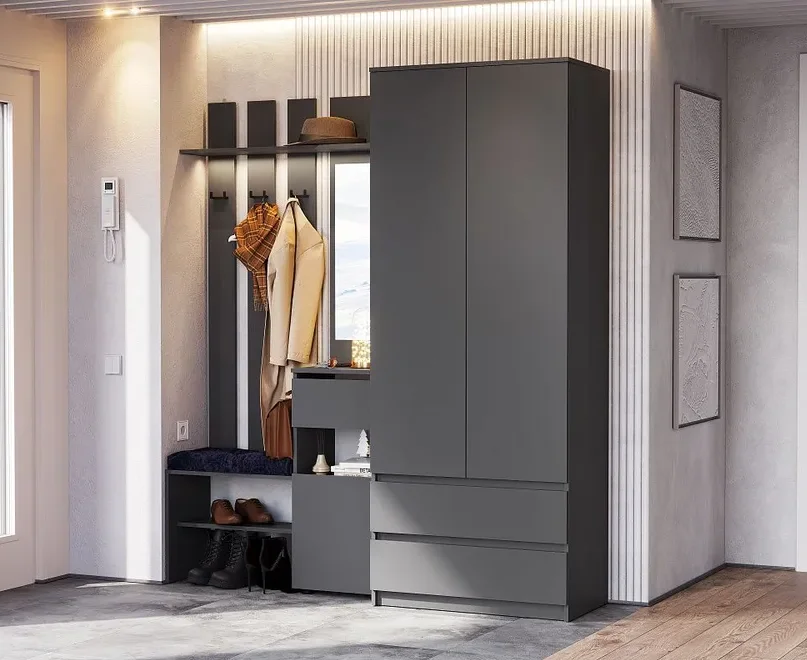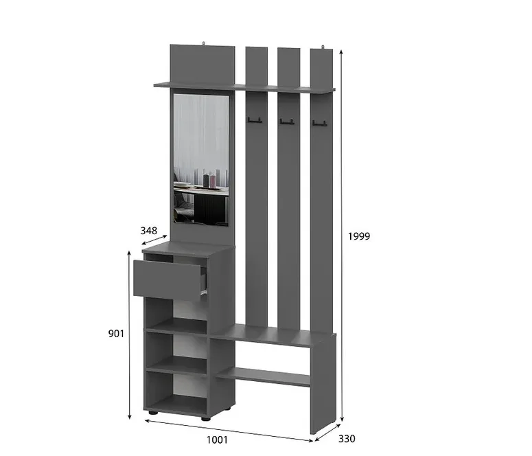 Сборка универсальная (собирается как на левую, так и на правую сторону). Обязательно крепление зеркала и вешалки к стене при помощи входящих в комплект плоских навесов. Максимальная нагрузка на ящики - 5 кг, на крышку тумбы - 20 кг, на верхнюю полку под вешалкой - 10 кг, на нижнюю полку под вешалкой - 5 кг, на полку вешалки - 3 кг.