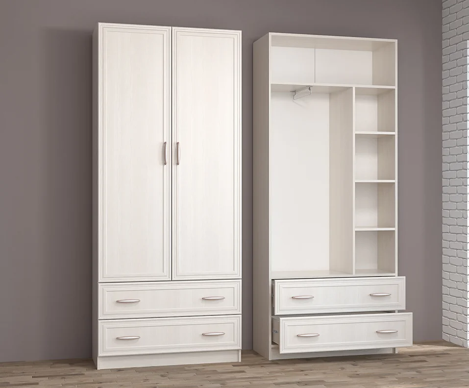 Также в прихожей есть распашной двухстворчатый шкаф с антресольной полкой, нишей с выкатной штангой для одежды и тремя вместительными полками, а также двумя выдвижными ящиками. Размеры шкафа — 900х2100х390 мм.