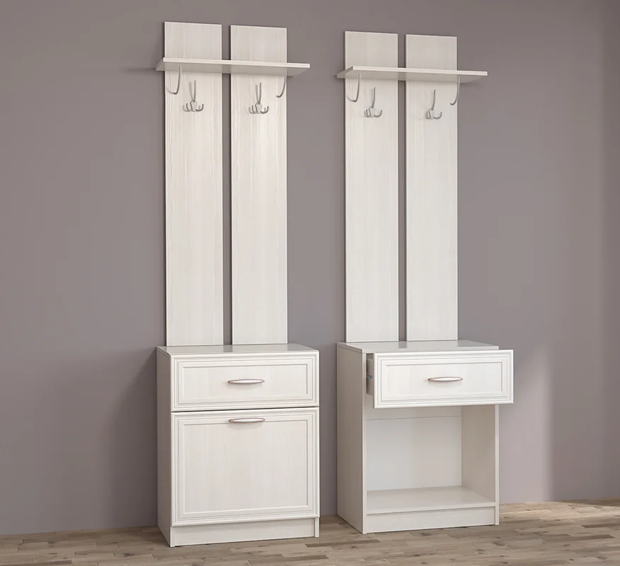 В набор прихожей входят несколько функциональных элементов. Вешалка с антресольной полкой для головных уборов и двумя трёхрожковыми крючками для одежды, объединённая с обувницей, которая включает выдвижной ящик и нишу с откидной створкой. Размеры этого модуля — 600х2100х390 мм.