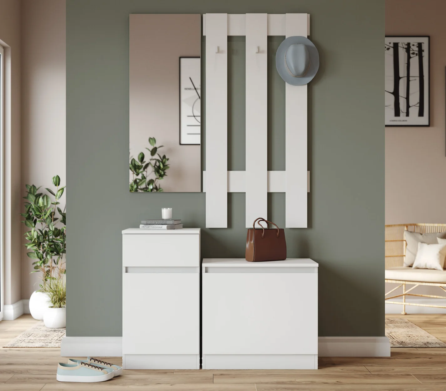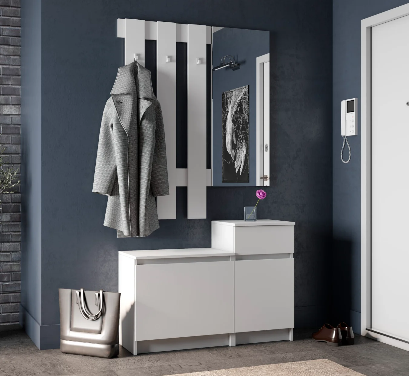 Модульная прихожая состоит из вешалки, зеркала и двух тумб. Это позволяет вам выбрать модули в соответствии с вашими потребностями и бюджетом.