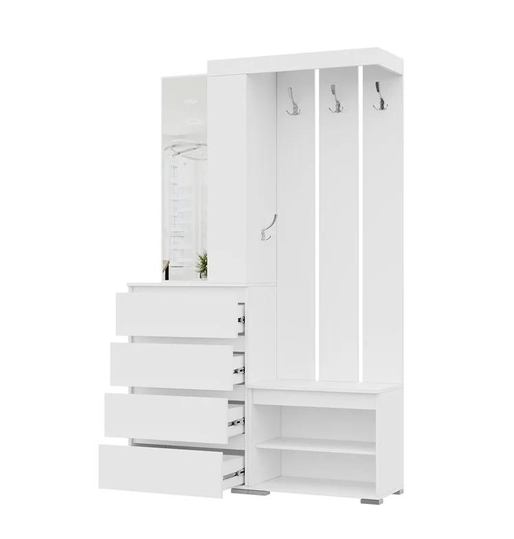 В комплект прихожей входят такие элементы, как вешалка, зеркало, комод, обувница и стеллаж. Зеркало размером 1000х400 мм имеет заднюю стенку из ЛДВП, что придает ему дополнительную прочность и устойчивость.