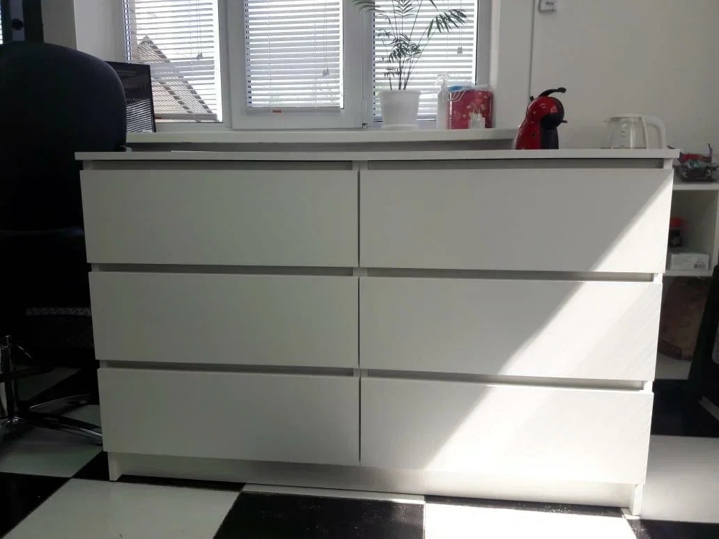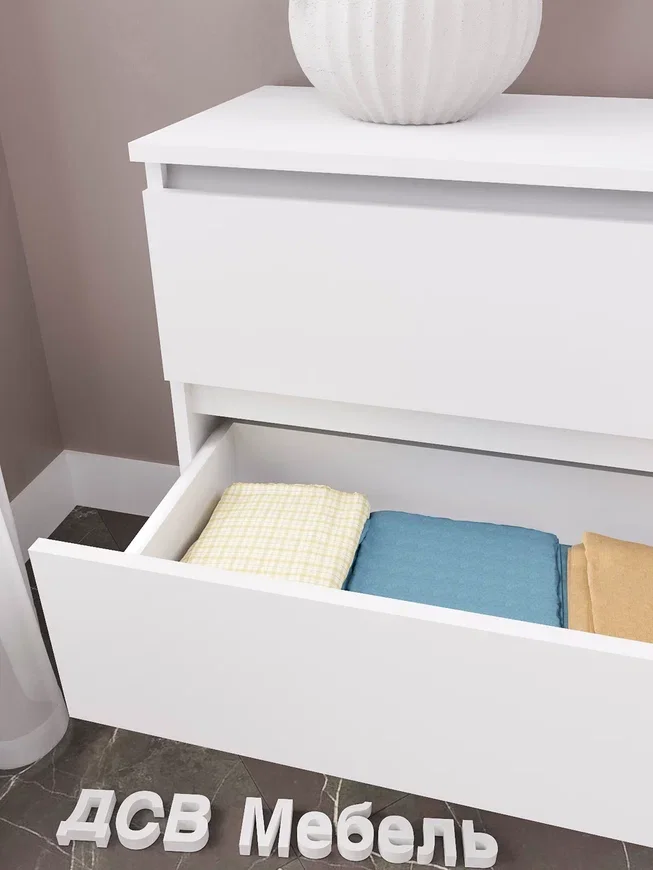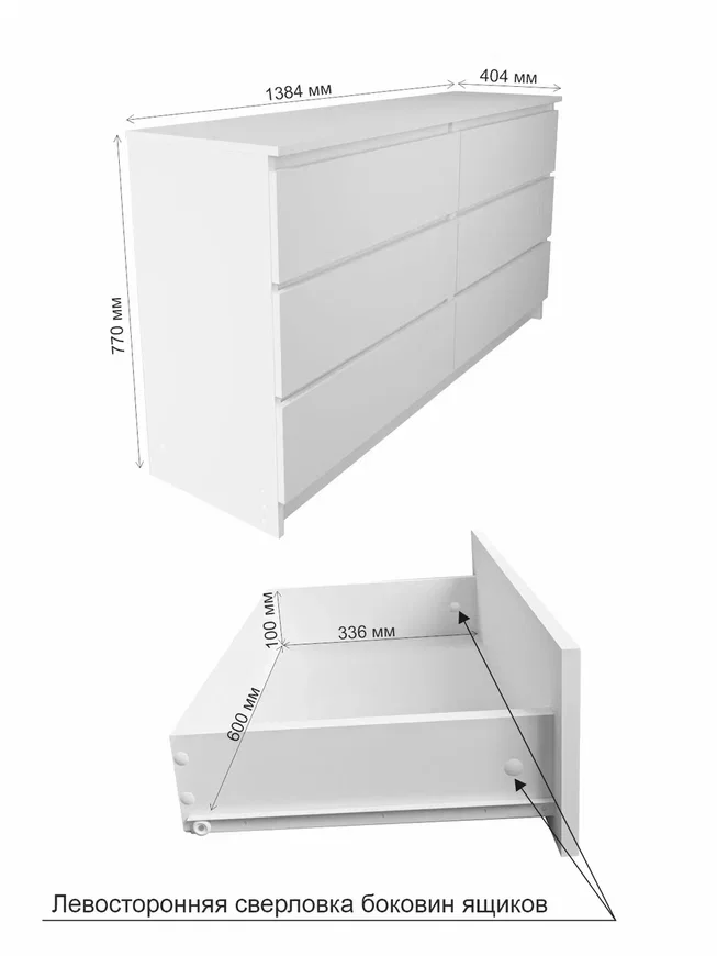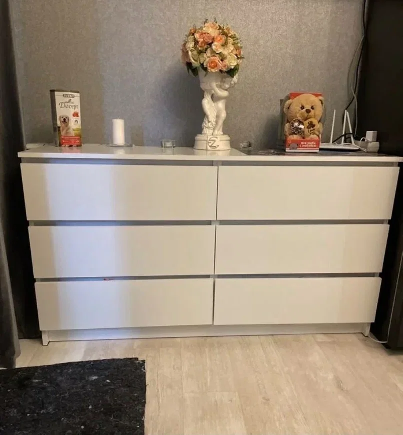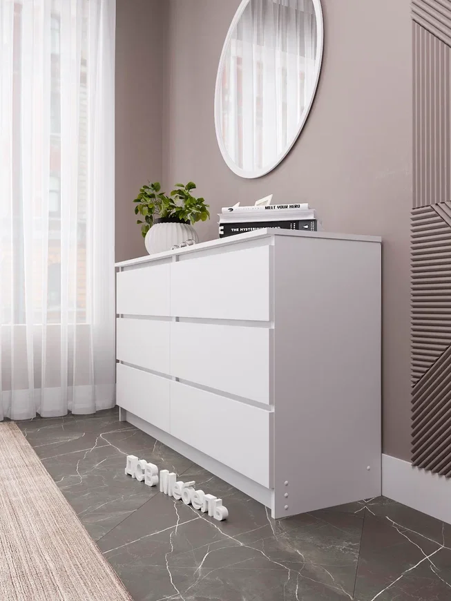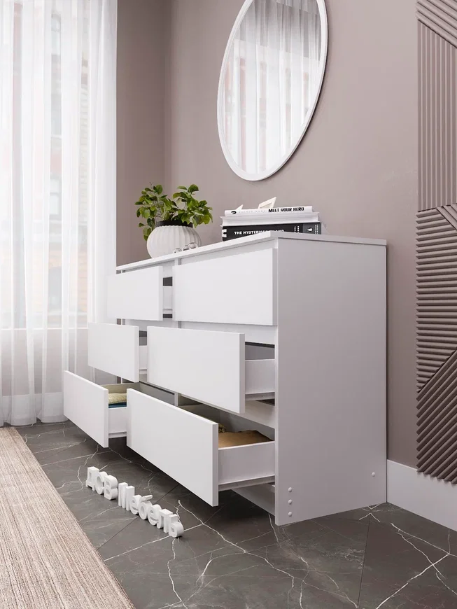 Комод оснащен шестью выдвижными ящиками, максимальная нагрузка на каждый из которых составляет 15 кг. Это позволяет хранить в них различные предметы и вещи, включая одежду, белье и другие аксессуары.