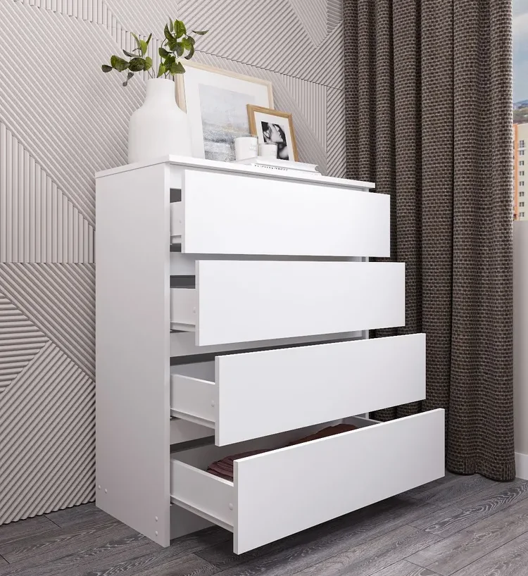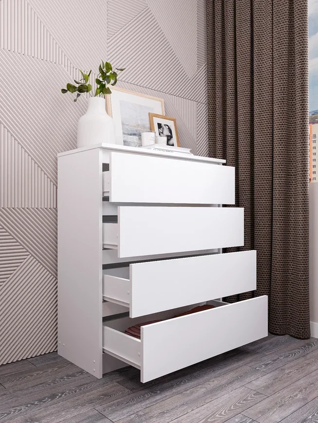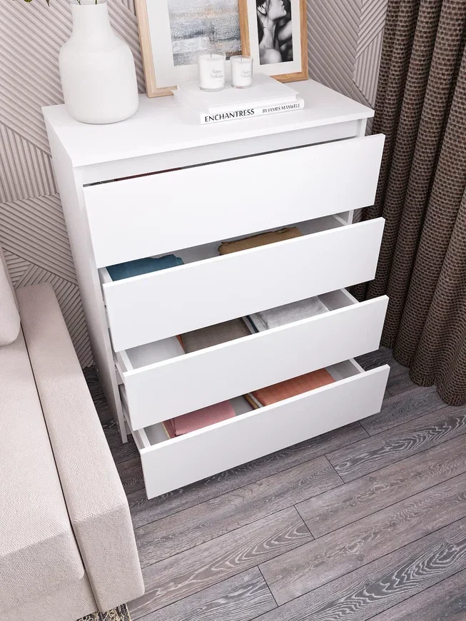 Комод оснащен четырьмя ящиками, максимальная нагрузка на каждый из которых составляет 5 кг. Это позволяет хранить в них различные предметы, от одежды до аксессуаров.
