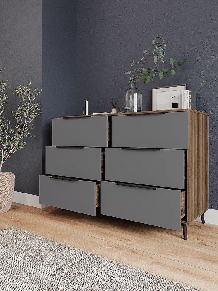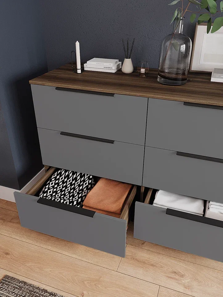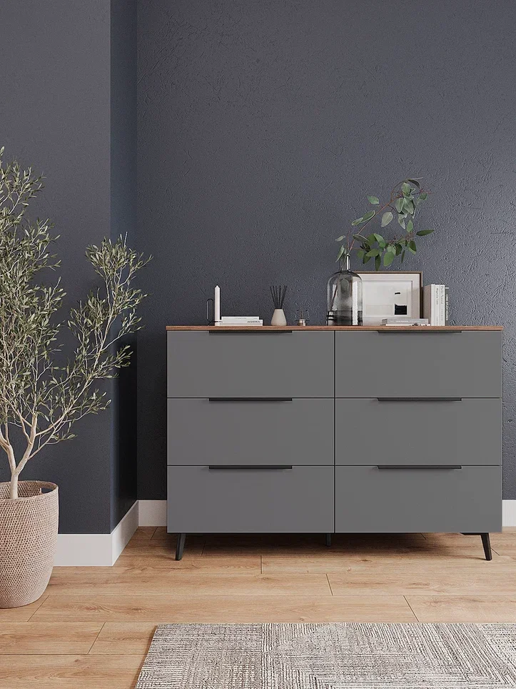 Корпус ЛДСП орех франклин. Фасад МДФ графит скин. Фасады Ройс с ручкой. Фурнитура скрытого монтажа с доводчиками гарантирует плавное закрывание ящиков. Металлические ножки высотой 12 см.