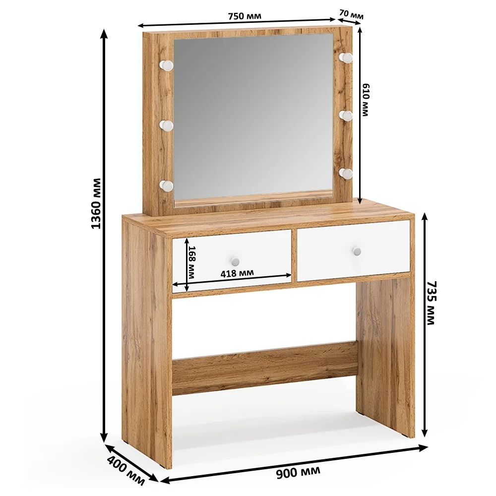 Габаритные размеры стола туалетного (ШхГхВ): 90 х 40 х 136 см.