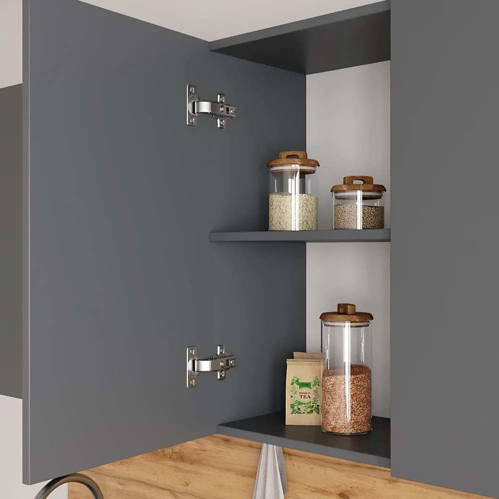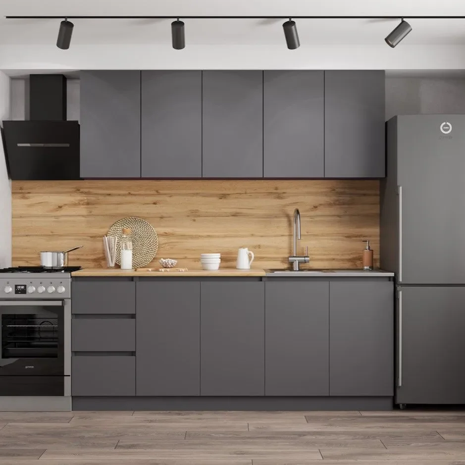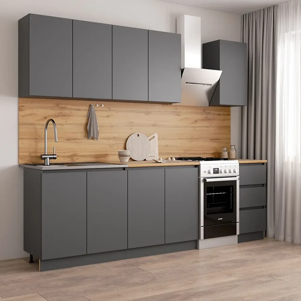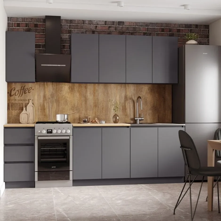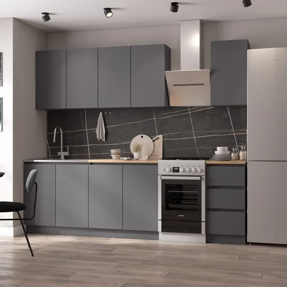 Гарнитур выполнен в цвете графит, что придает ему стильный и современный вид. Корпус и фасады изготовлены из ЛДСП, что обеспечивает прочность и долговечность конструкции.