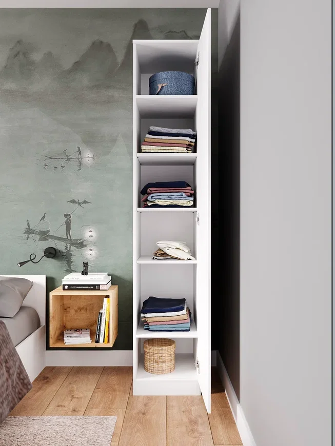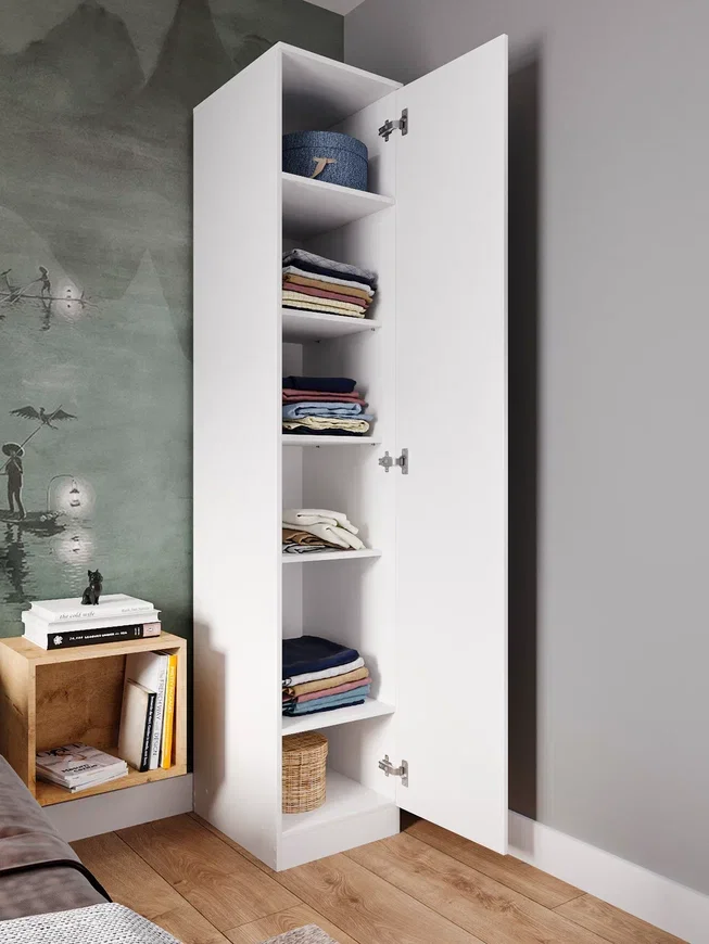 Шкаф оснащен распашными дверцами, которые открываются в любую сторону - справа, слева или в углу. Это обеспечивает удобный доступ к содержимому шкафа и позволяет разместить его в любом углу комнаты.