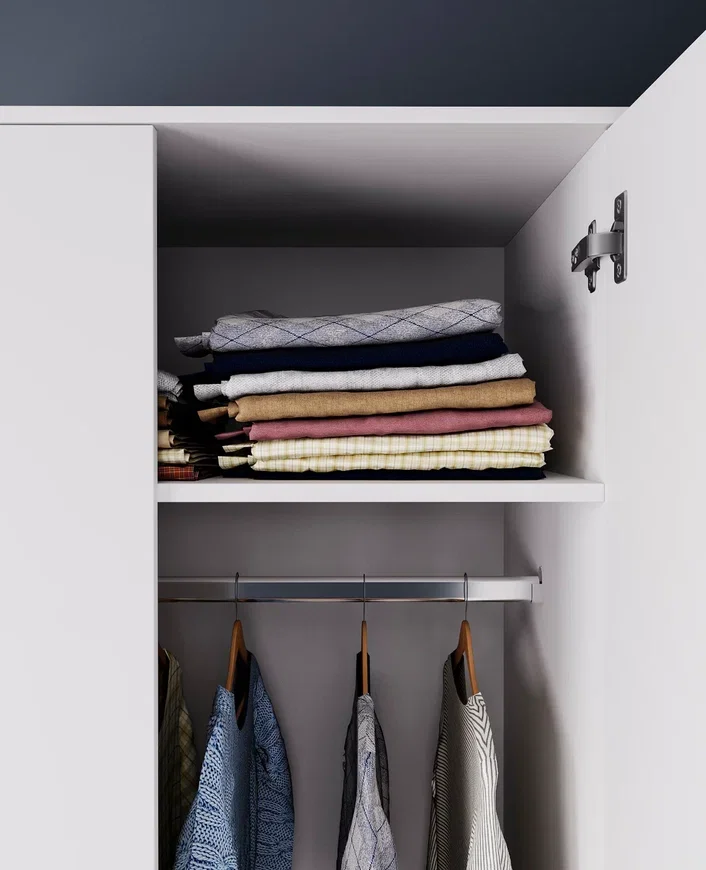 Шкаф оснащен штангой для вешалок, что позволяет хранить одежду в аккуратном виде. Также в шкафу предусмотрено две полки, на которых можно разместить обувь или аксессуары.