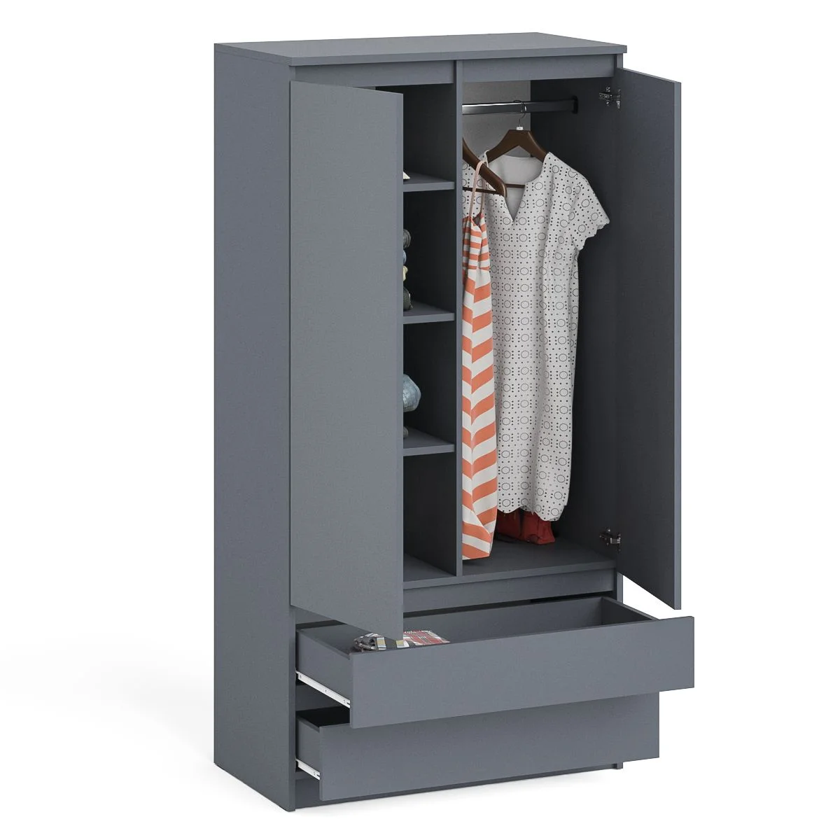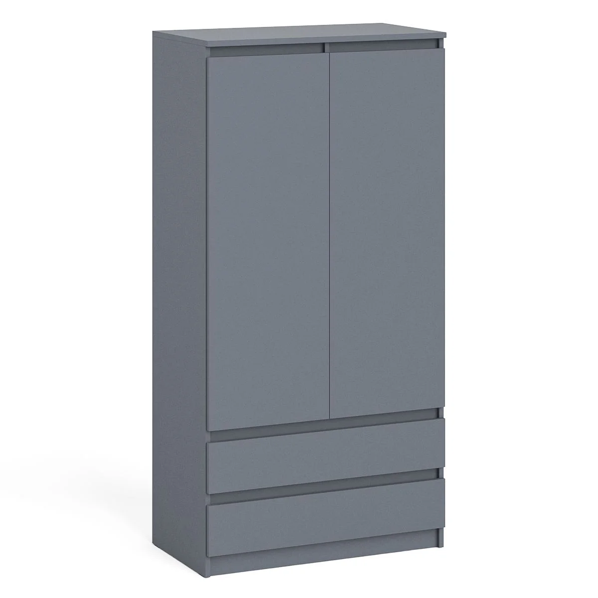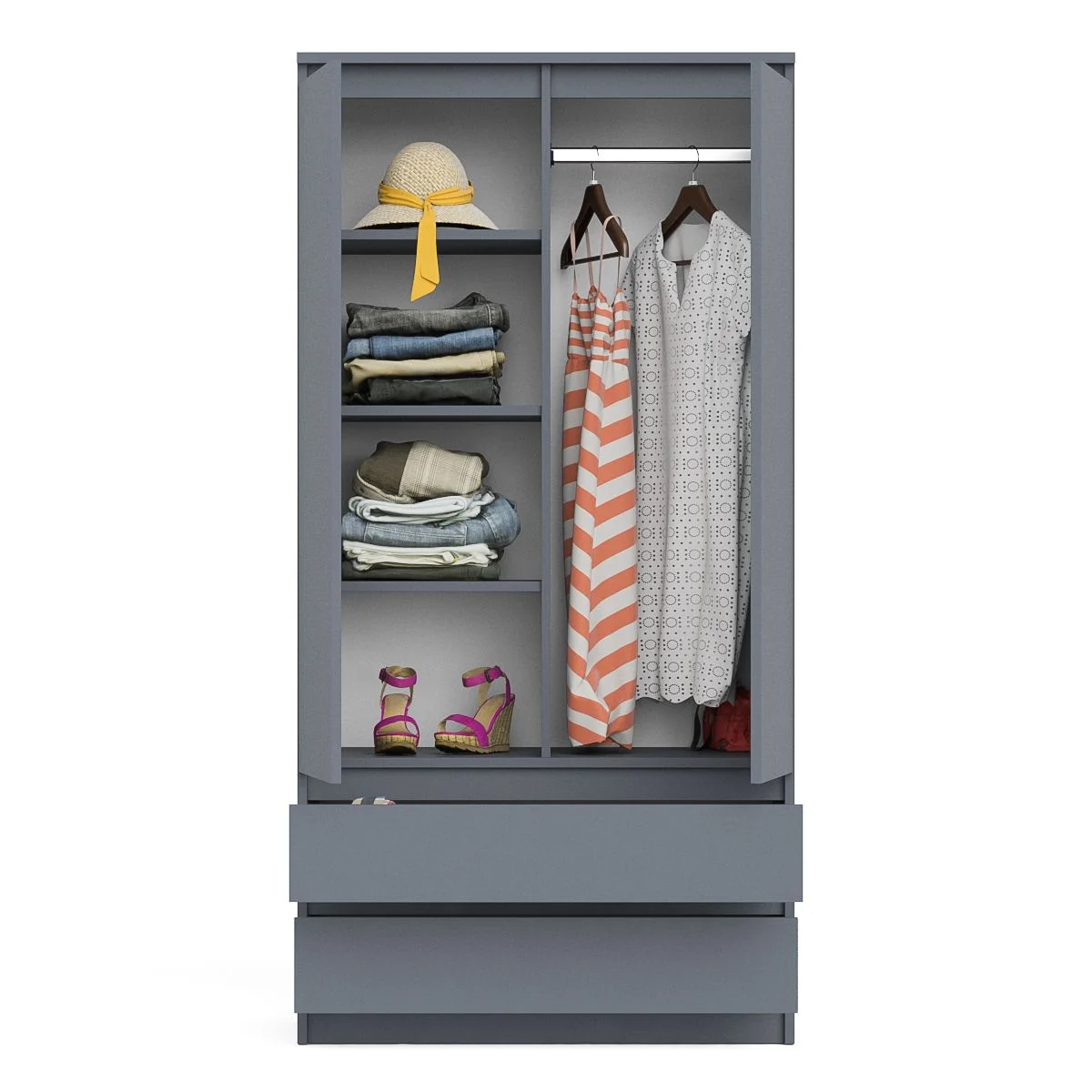 Шкаф оборудован двумя распашными дверями, тремя полками и двумя выдвижными ящиками на роликовых направляющих L=350 мм. Лицевая фурнитура отсутствует, а фасады открываются за счет системы Push-to-open, что обеспечивает удобство и простоту использования.