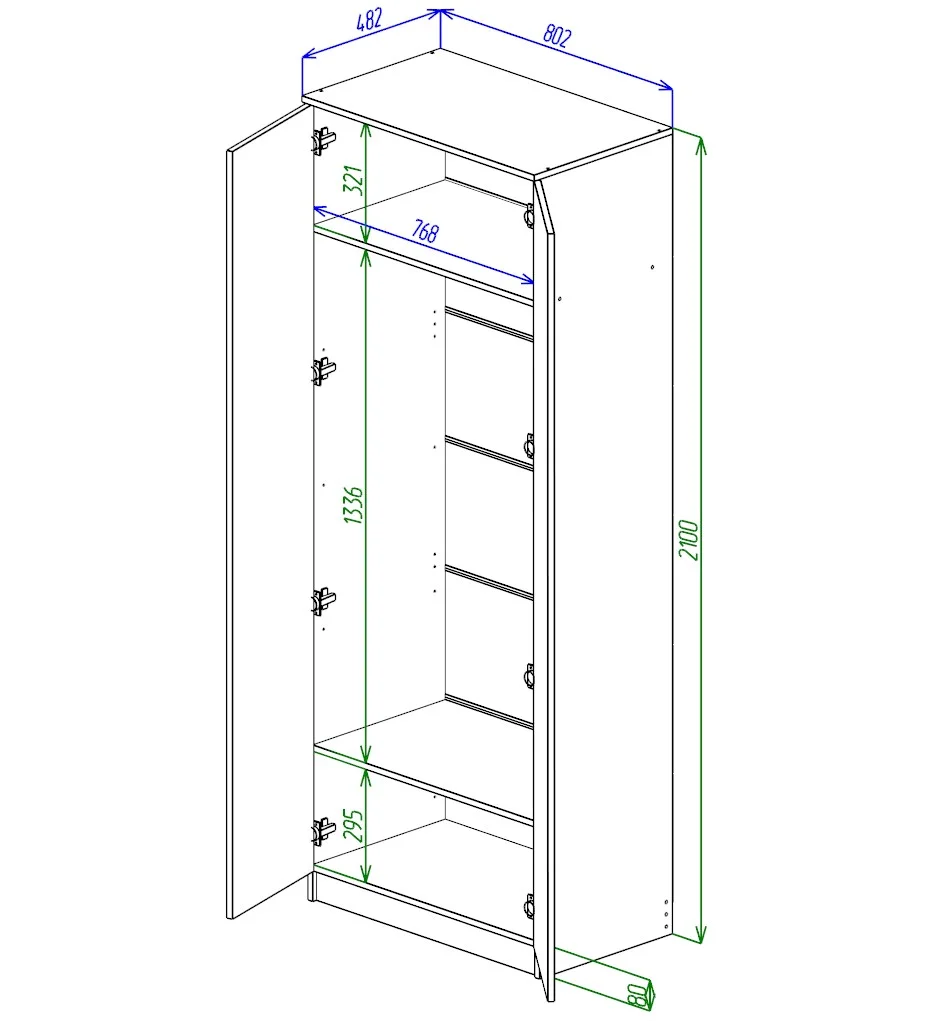 Шкаф оснащен штангой для вешалок, что позволяет разместить большое количество одежды. В комплекте идут две полки и фурнитура из металла, что обеспечивает надежность и долговечность конструкции.