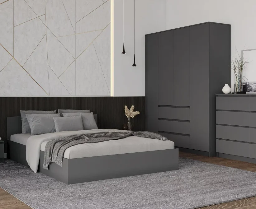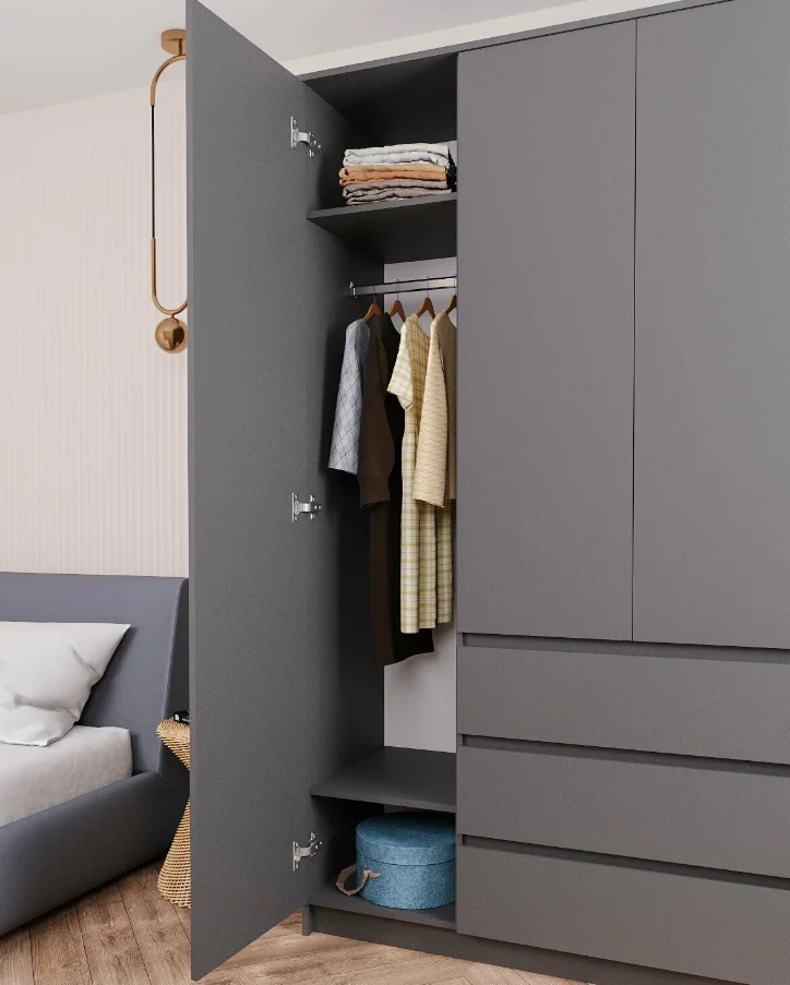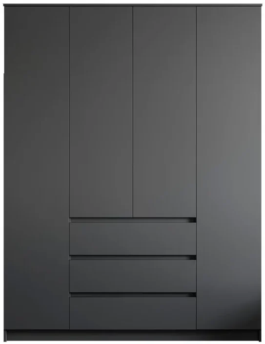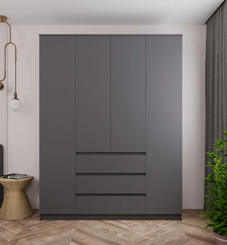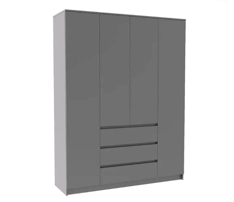 Конструкция позволяет разместить большое количество одежды и других вещей. Конструкция шкафа предусматривает наличие четырех дверей и трех ящиков. Это позволяет организовать удобное хранение одежды, аксессуаров и других предметов. Корпус шкафа изготовлен из качественного ЛДСП, что гарантирует его прочность и долговечность.