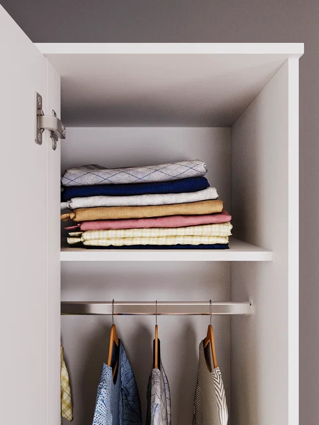 Шкаф оснащен платяной штангой и полками, что позволяет удобно хранить одежду и другие предметы. Фасады перевешиваемые и могут устанавливаться с правым или левым направлением открывания. Открывание происходит путем нажатия на фасад, который отталкивается от корпуса магнитным толкателем.