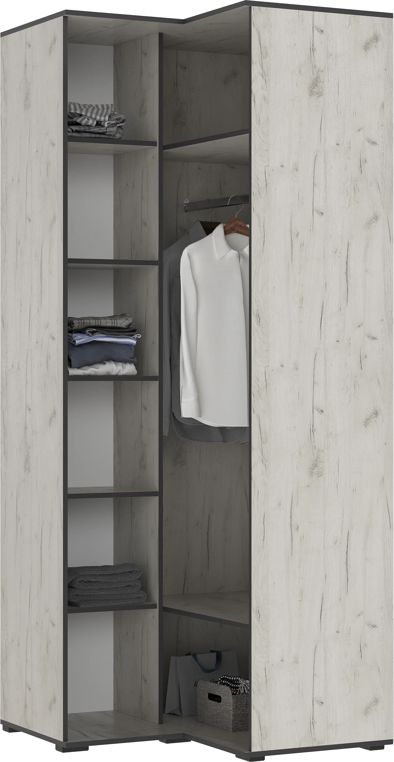 Внутри шкафа расположены удобные полки для одежды, обуви и аксессуаров, а также штанга для хранения верхней одежды.