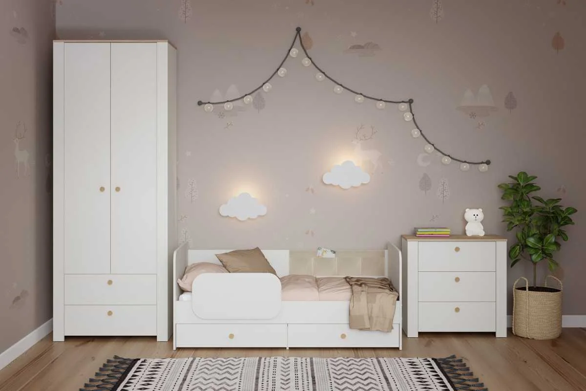 Модульная мебель Джастин включает белый шкаф для одежды и угловой шкаф. В комплект входят письменный стол с комодом и торцевой шкаф. Также есть кровать. Все элементы выполнены в белом цвете с текстурой шагрень и дополнены деталями из тона белого дуба.