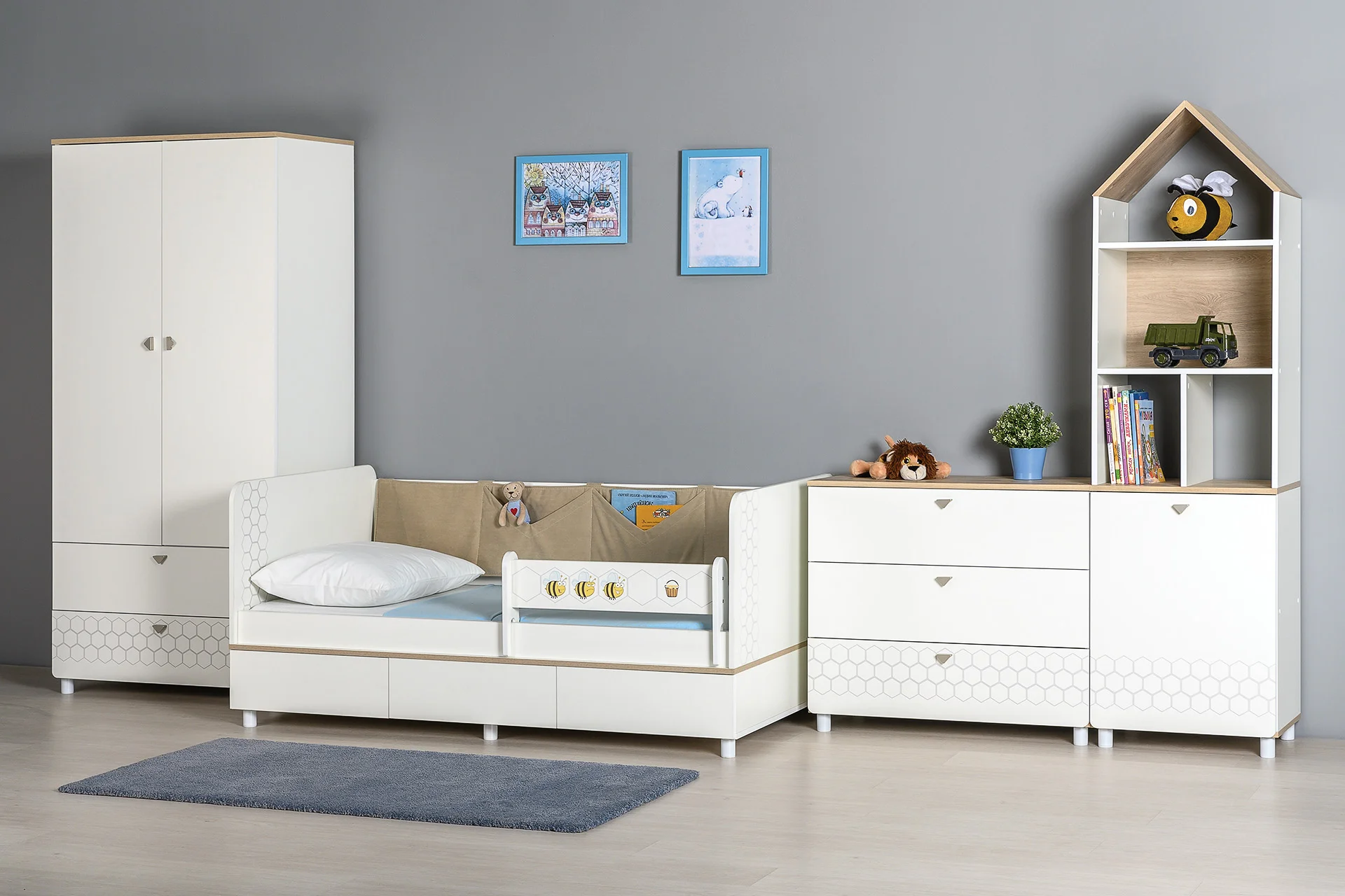 В интерьере детской гармонично смотрится модульная мебель Эйп в светлых тонах: белый и белый дуб. Шкаф для одежды помогает поддерживать порядок, комод удобен для хранения игрушек, а кровать с бортиком обеспечивает безопасность ребенка. Стеллаж может стать местом для размещения книг и любимых игрушек ребёнка. Модульные элементы мебели Эйп легко комбинируются между собой, что позволяет создать удобное и функциональное пространство.